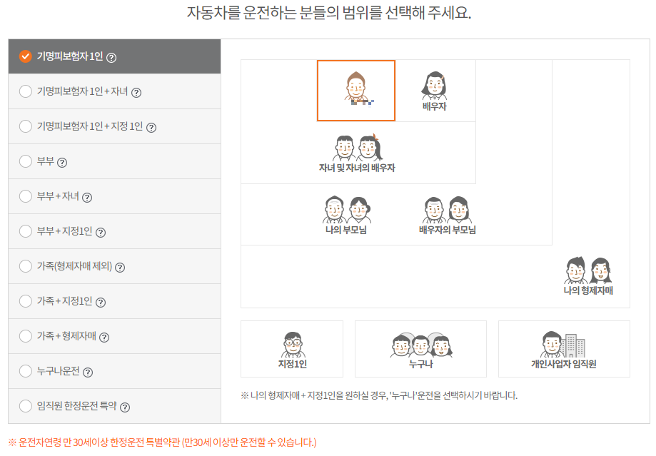 운전자 범위를 지정해주어야 합니다. 본인이 혼자 운행한다면 피보험자1인, 가족이나 배우자 등 가족이 함께 운행한다면 범위를 지정해주도록 합니다. 범위를 넓게 지정할수록 자동차보험 가격이 상승합니다.