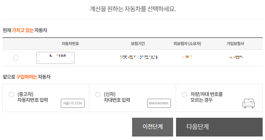 현재 가지고있는 차량에 보험을 가입하려면 가지고있는 자동차를 클릭, 앞으로 차를 구매할 계획이라면 아래의 자동차번호 또는 차대번호를 입력해주도록 합니다.