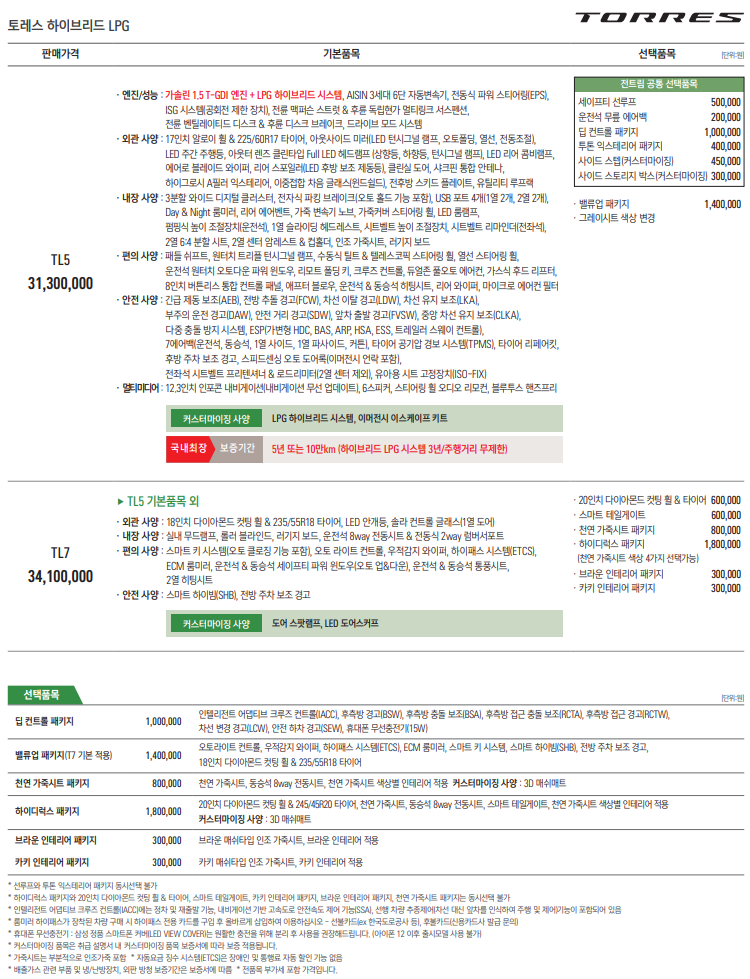 토레스 lpg 하이브리드 가격은 TL5 3,130만원, TL7 3,410만원입니다. 여기에 옵션을 추가하면 가격이 상승하게 됩니다. 일반 가솔린 토레스의 가격이 궁금하시다면 이 링크를 확인해보시기 바랍니다. 자동차 가격표가 잘 안보이신다면 파일을 다운로드 할 수 있습니다.
