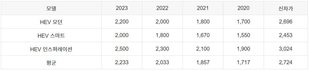 | HEV 인스퍼레이션 | 2,500 | 2,300 | 2,100 | 1,900 | 3,024 |