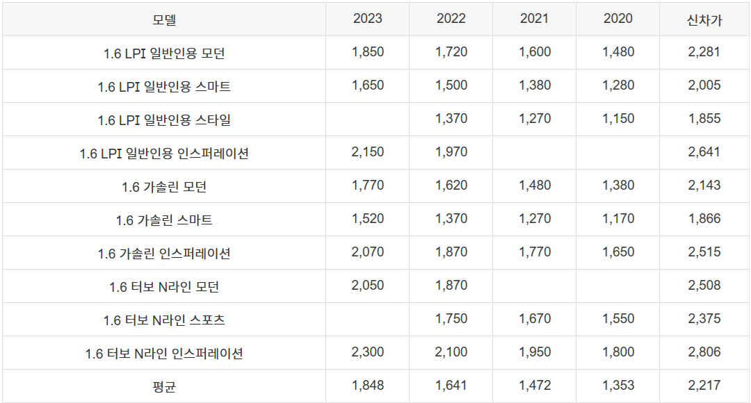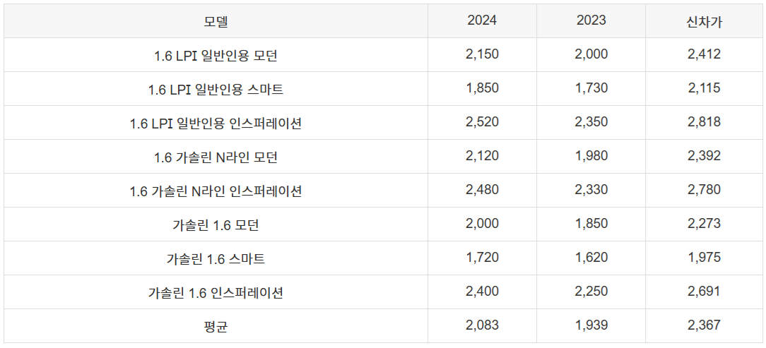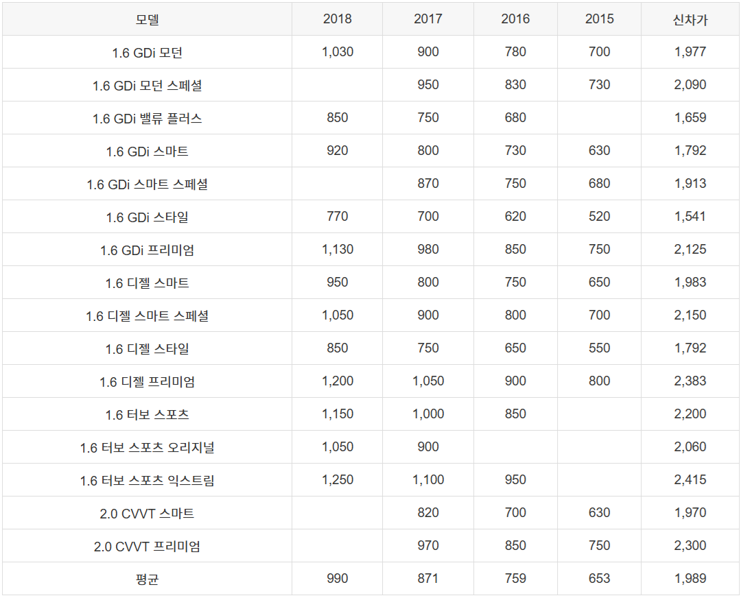 | 가솔린 1.6 모던 | 2,000 | 1,850 | 2,273 |