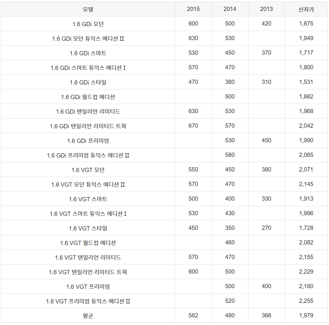 | 모델 | 2015 | 2014 | 2013 | 신차가 |