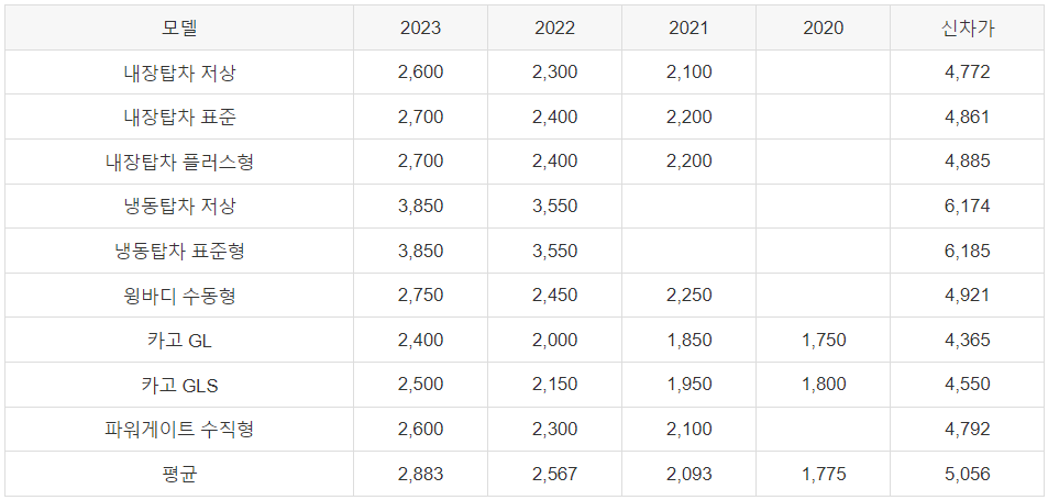 | 모델 | 2023 | 2022 | 2021 | 2020 | 신차가 |