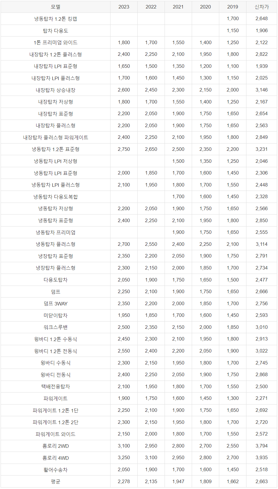 | 다용도탑차 | 2,050 | 1,900 | 1,750 | 1,650 | 1,500 | 2,477 |