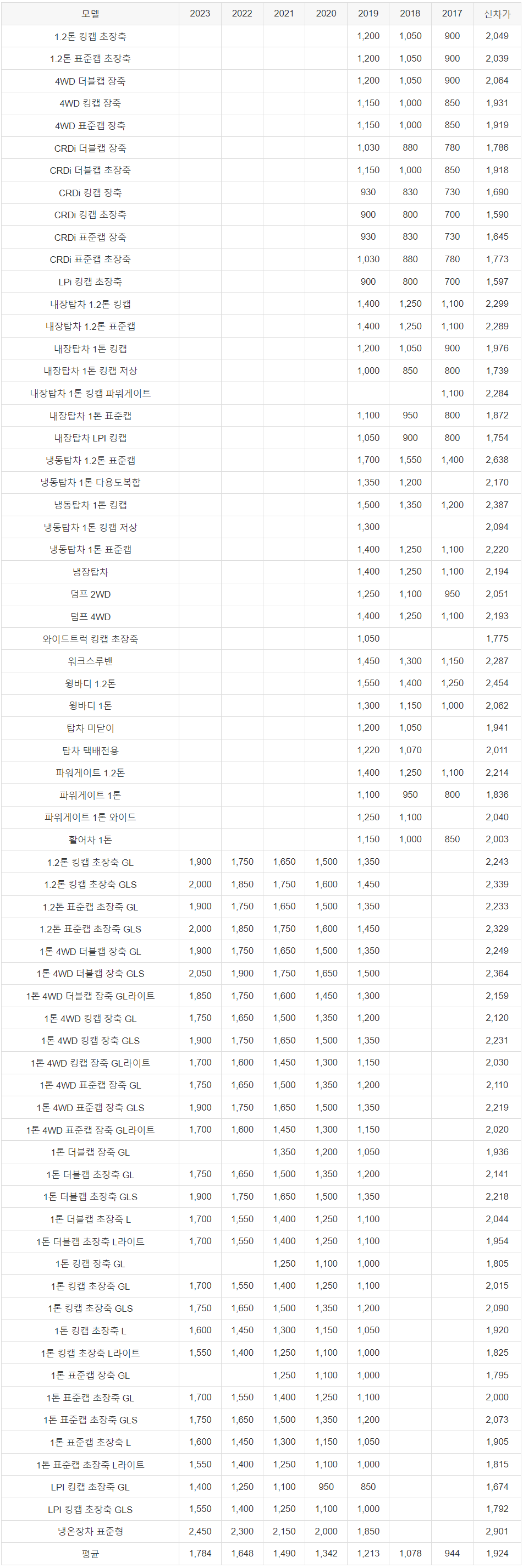 | 1톤 4WD 더블캡 장축 GL라이트 | 1,850 | 1,750 | 1,600 | 1,450 | 1,300 | 2,159 | ||
