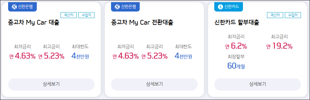 | 중고차 대출 | 2025 금리 한도 기간 | 신한마이카 KB매직카 드림카 대출 (0) | 2025.06.06 |