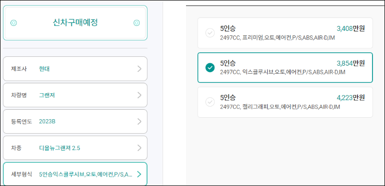 3. 기존 차량을 갱신하는지? 차량번호를 알고있는지? 구입예정인지를 선택 후 본인의 차량을 선택해줍니다.