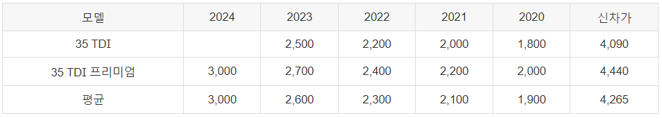 | 35 TDI 프리미엄 | 3,000 | 2,700 | 2,400 | 2,200 | 2,000 | 4,440 |