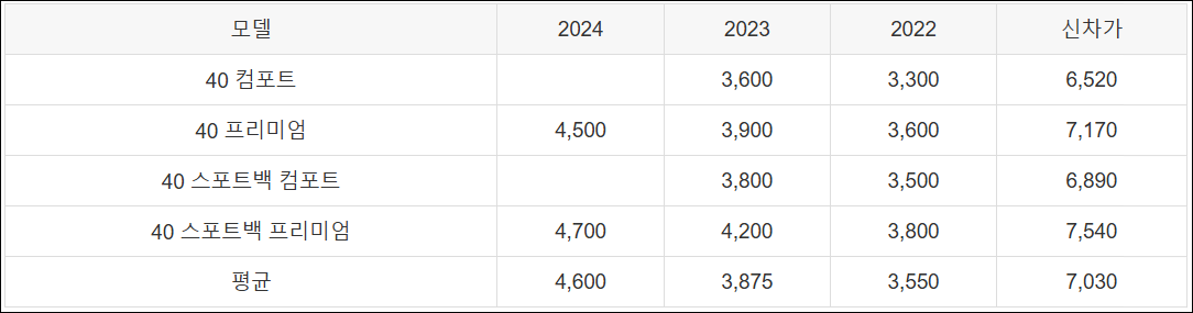 | 모델 | 2024 | 2023 | 2022 | 신차가 |