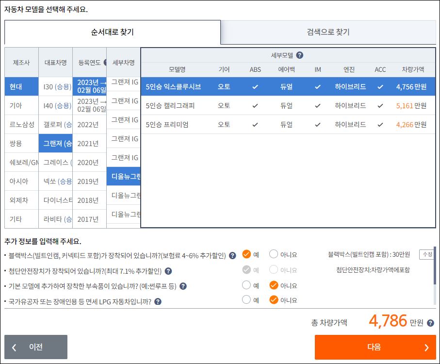 본인의 자동차를 갱신하는것인지? 새로 구매하는것인지? 선택 후 가입할 자동차 기종을 정확하게 선택해주도록 합니다.