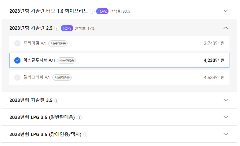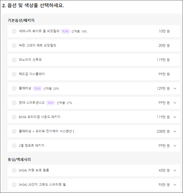 원하는 자동차 옵션을 선택해줍니다. 선택률도 함께 나와있어서 보기 간편합니다.