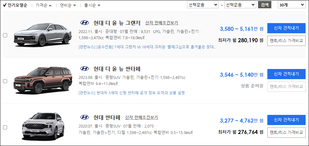 현대자동차 견적을 내기 위해서는 우선 가격표를 통해 자동차에 어떤 옵션이 들어가는지?, 어떤 트림을 선택할것인지 골라주어야 합니다. 차량의 가격표를 확인해보시려면 링크를 확인해보시기 바랍니다.