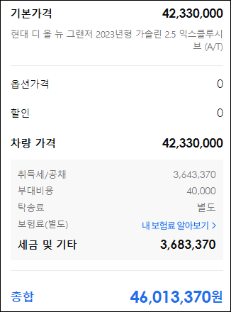 이렇게되면 자동차 가격을 정리해서 보여줍니다. 함께 납부할 취등록세 및 부대비용도 알려주어서 계산이 간편하게 가능합니다.