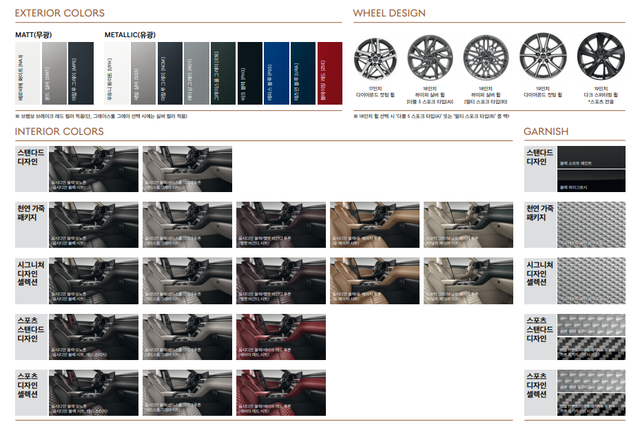 - 사계절 AS-02는 225/50R17, 225/45R18 사이즈가 적용되며, 19인치 여름 UHP인 미슐랭 파일럿 스포츠 4는 프론트 225/40R19, 후륜 255/35R19에 적용되며, 스팅어와 동일한 홍면 피스톤 캘리퍼가 장착됩니다. 파격성에 가까웠던 스팅어에 비해 상당히 품위 있고 타협적이어서 최대한 다수의 취향에 맞춘 디자인이라는 평가와 함께 너무 담백(?)하다는 평가도 있습니다.