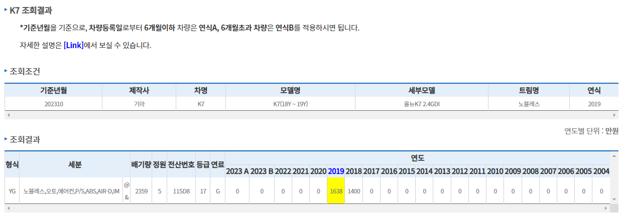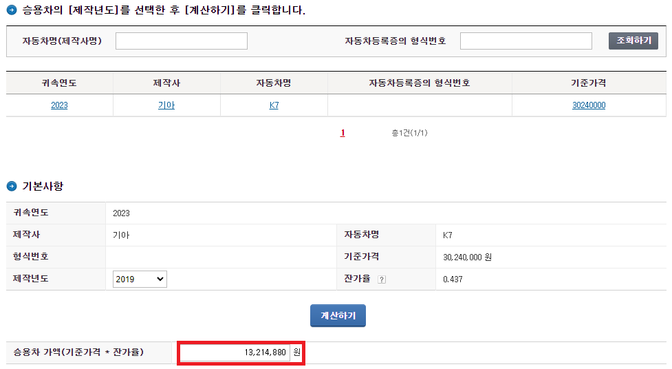 이렇게 형식번호를 입력완료하면 내 차량의 제작년도를 제대로 설정해주면 현재시점의 차량가액이 확인할 수 있습니다.