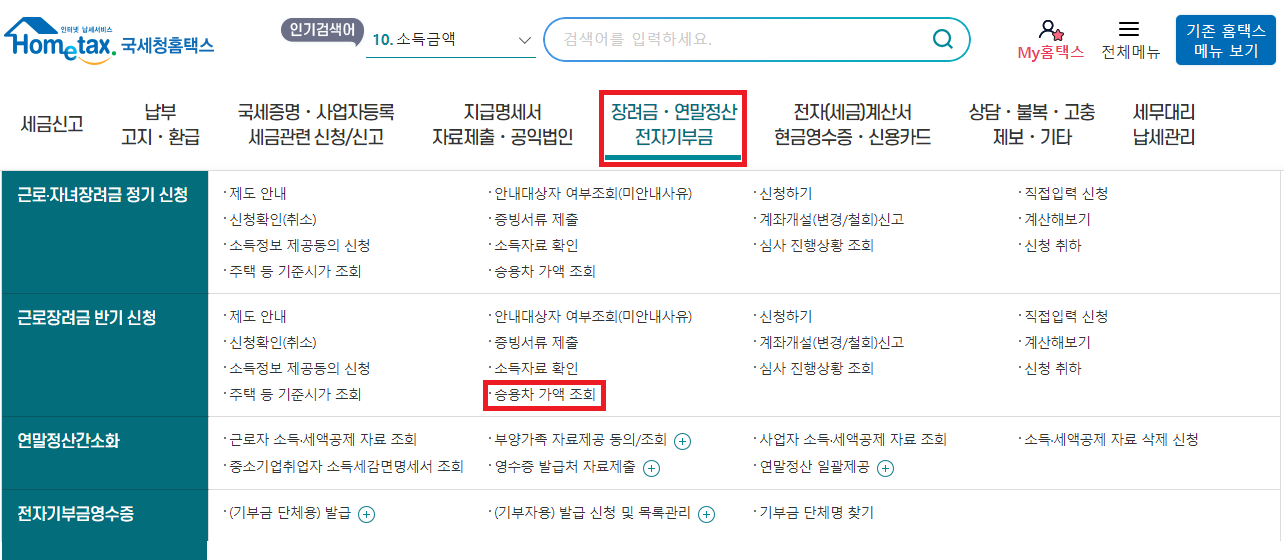 홈택스 홈페이지에서 장려금,연말정산 전자기부금 메뉴에 마우스를 올린 후 승용차 가액 조회를 클릭합니다.