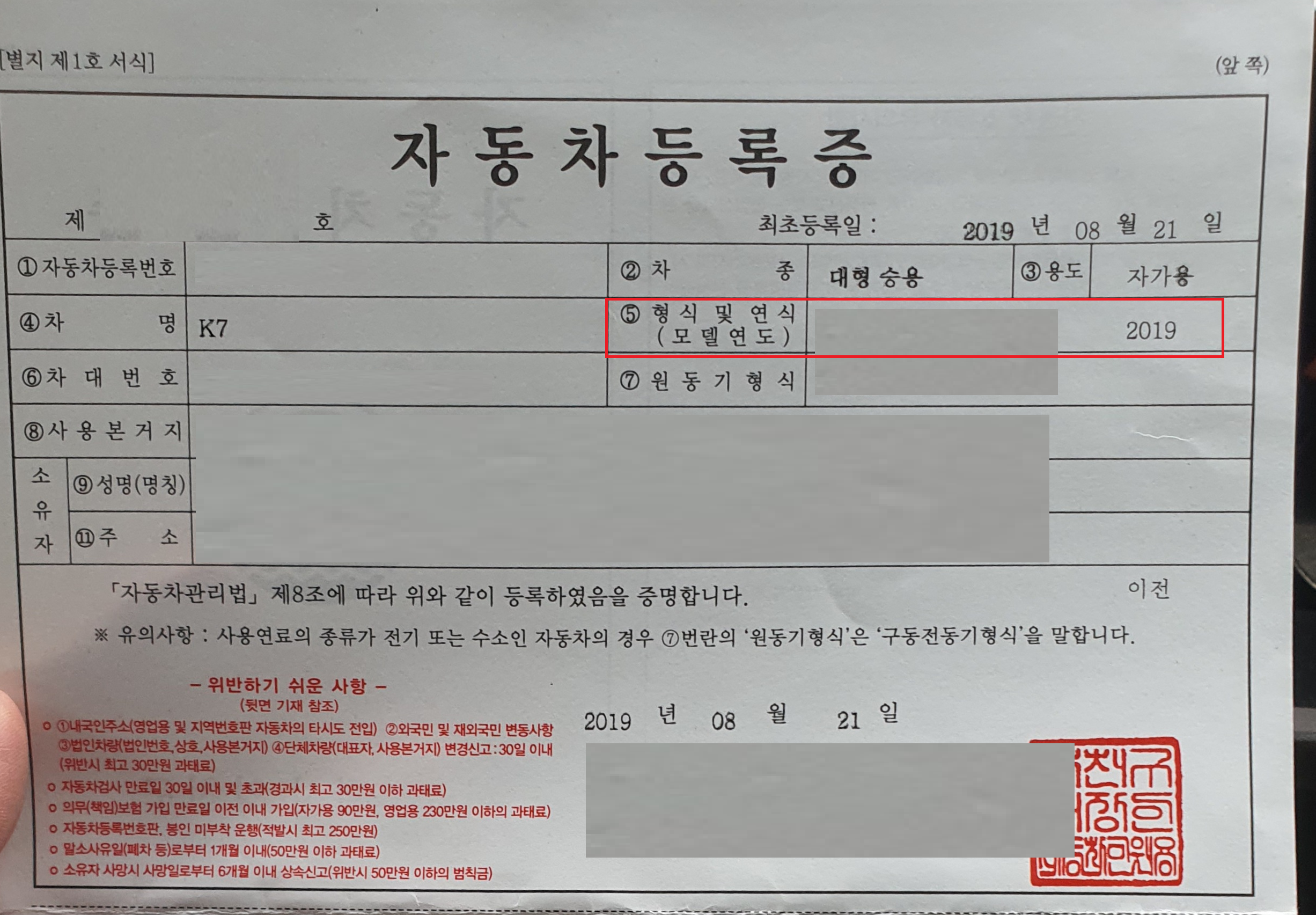 자동차등록증 형식번호를 확인하기 위해 자동차등록증을 보면 우측 상단에 형식 및 연식이 나와있습니다. 이부분 전체를 형식번호에 입력해주도록 합니다.
