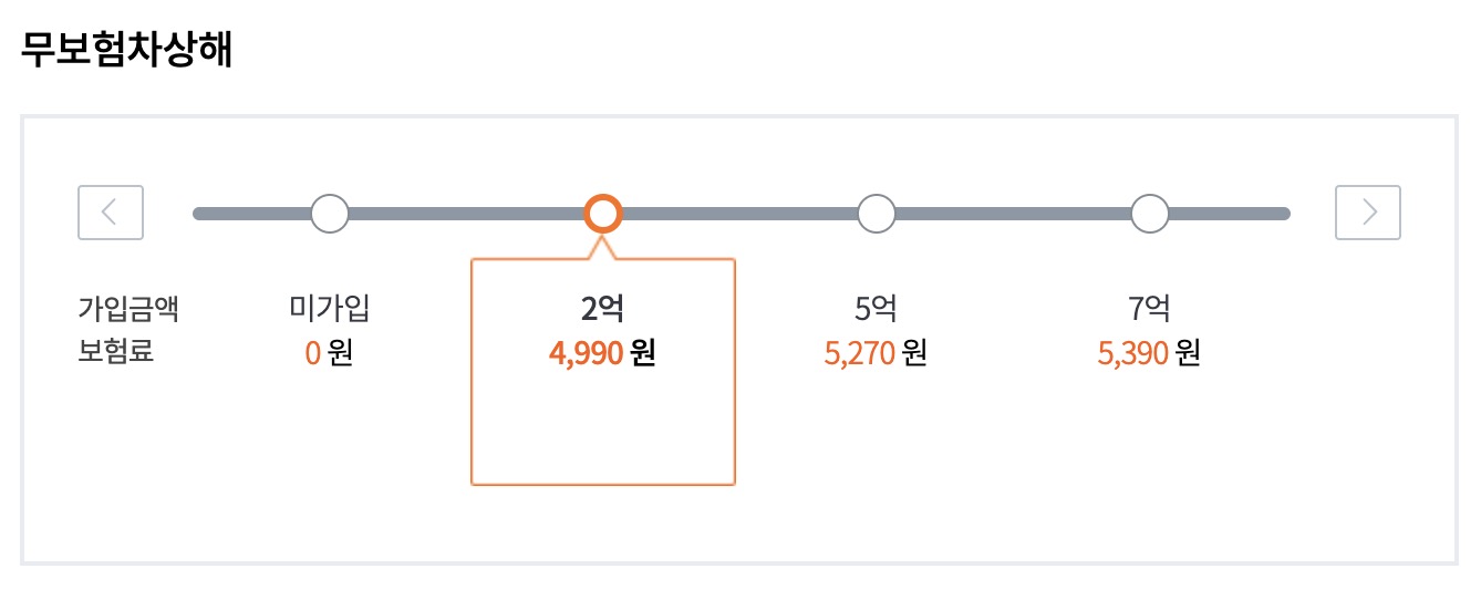 무보험차상해 보장금액의 경우 삼성화재 다이렉트 자동차보험을 기준으로 미가입 0원, 2억 4990원, 5억 5270원, 7억 5390원입니다. 보장금액이 커져도 보험료는 크게 오르지 않기 때문에 가장 높은 7억으로 가입하는것이 좋겠습니다.