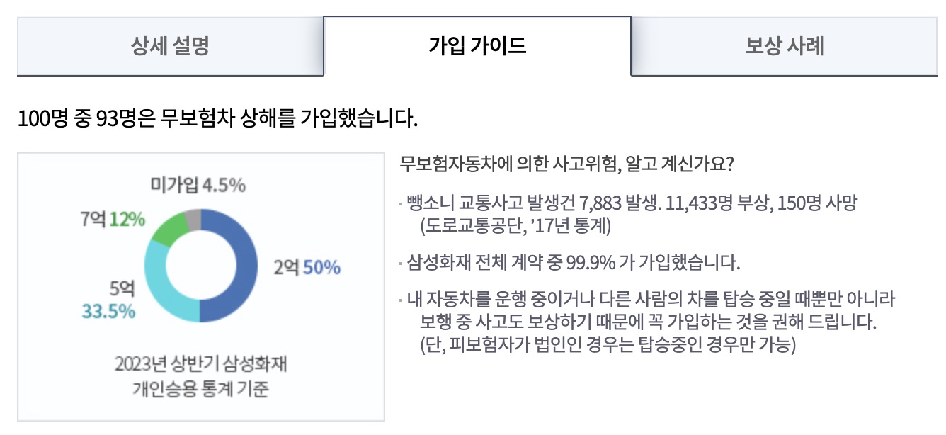 100명중 93명은 무보험차상해 특약에 가입하는 통계가 있습니다. *출처: 삼성화재 자동차보험