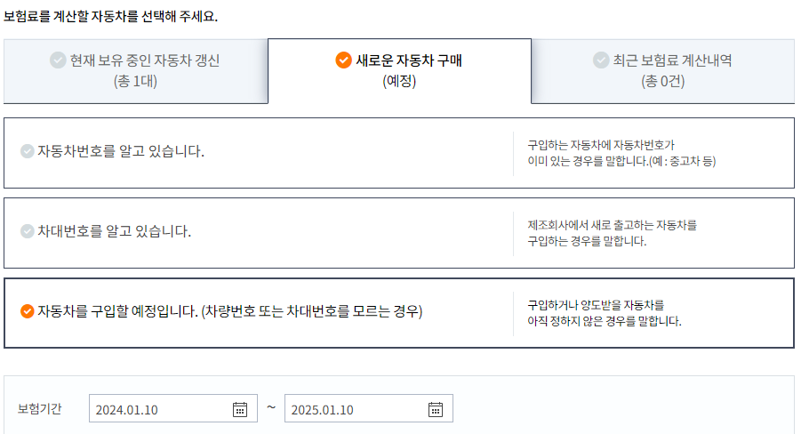 자동차보험에 가입할 기간을 선택 후, 보험에 가입할 자동차를 선택해주어야 합니다.