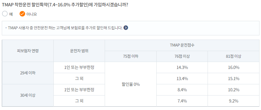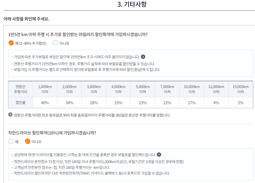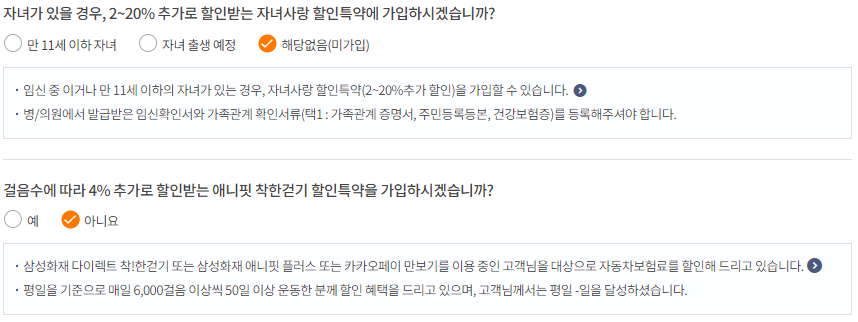운전거리 할인, 안전운전 할인, 자녀할인, 걸음수 할인 등 다양한 할인을 받을 수 있으니 본인이 해당된다면 할인을 선택해서 받아주도록 합니다.