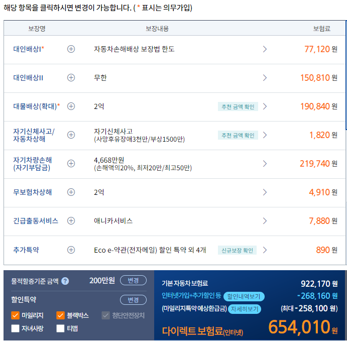 여기에서 특약을 다르게 선택할 경우 자동차보험료가 달라지게 됩니다. 자동차보험 특약을 선택하는 방법은 아래 링크에 상세하게 설명해놓았으니 참고하시기 바랍니다.
