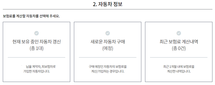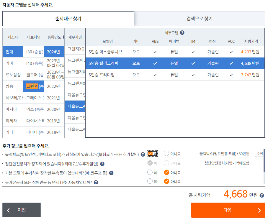 자동차보험에 가입할 차량을 선택해줍니다.