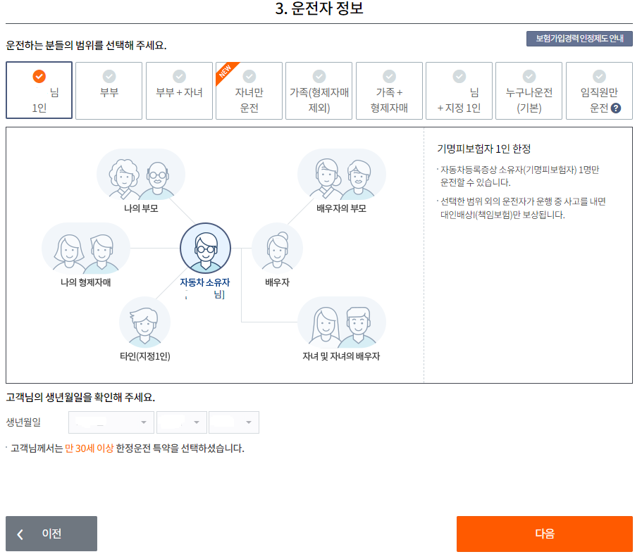 이후 운전자 범위를 선택해줍니다. 운전자 1인일 경우 자동차보험료가 가장 저렴하고, 누구나 운전처럼 범위가 넓어질 경우 자동차보험료가 비싸지게 되니 참고하시기 바랍니다.