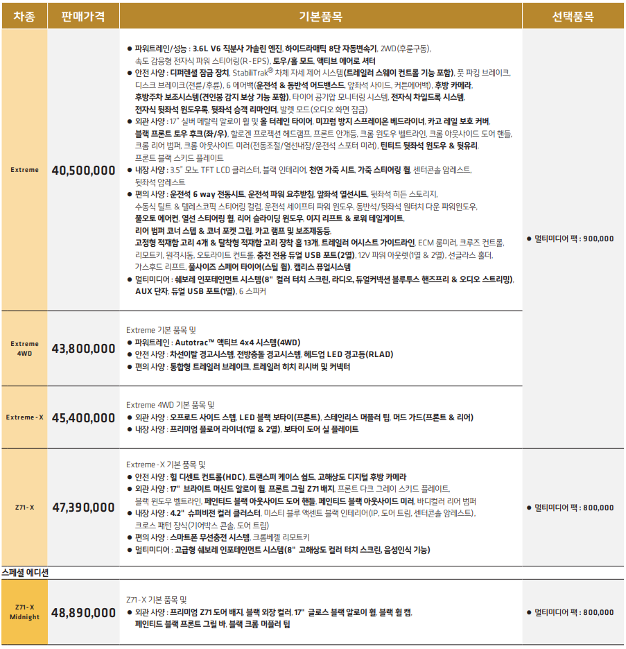 콜로라도 가격표 정리해보도록 하겠습니다. 쉐보레 콜로라도는 쉐보레에서 제조 및 판매하는 중형 픽업 트럭으로, 강인하고 실용적인 디자인과 뛰어난 성능으로 많은 인기를 얻고 있습니다. 콜로라도는 다양한 트림과 옵션을 제공하여 소비자의 다양한 요구와 취향을 충족시키도록 설계되었습니다.
