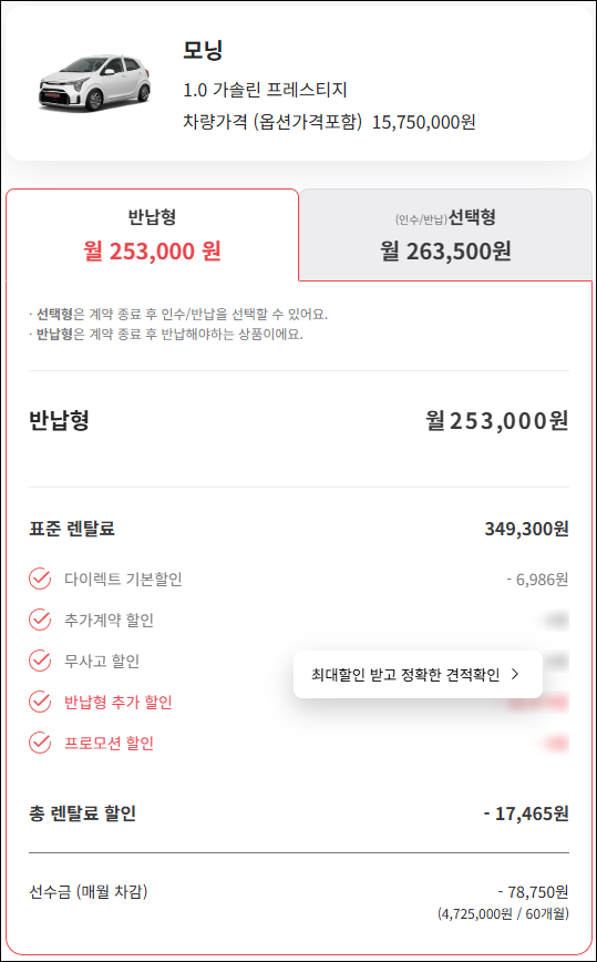 조건 : 60개월, 연간 1만키로 이하, 대물 5억, 운전자범위 가족, 모닝 프레스티지 트림, 선수금 30% (차량가격 1575만원)
