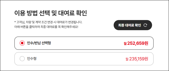 - 만기 인수 시 절차와 비용: 만기 시 차량 인수를 고려한다면, 인수 가격, 취득세, 번호판 변경 등의 절차와 비용을 사전에 확인해야 합니다.