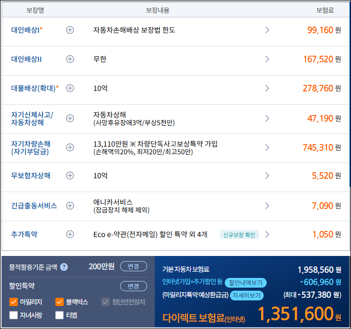 가입 조건이 변경되는 경우 또는 나이 및 차량에 따라 보험료가 달라질 수 있습니다.