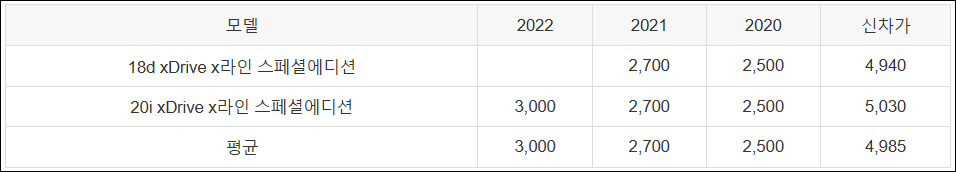 | 20i xDrive x라인 스페셜에디션 | 3,000 | 2,700 | 2,500 | 5,030 |