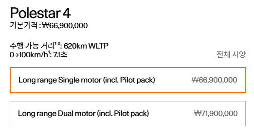 폴스타4 가격은 파일럿 팩 포함 롱레인지 싱글모터 6,690만원, 롱레인지 듀얼모터는 7,190만원입니다.
