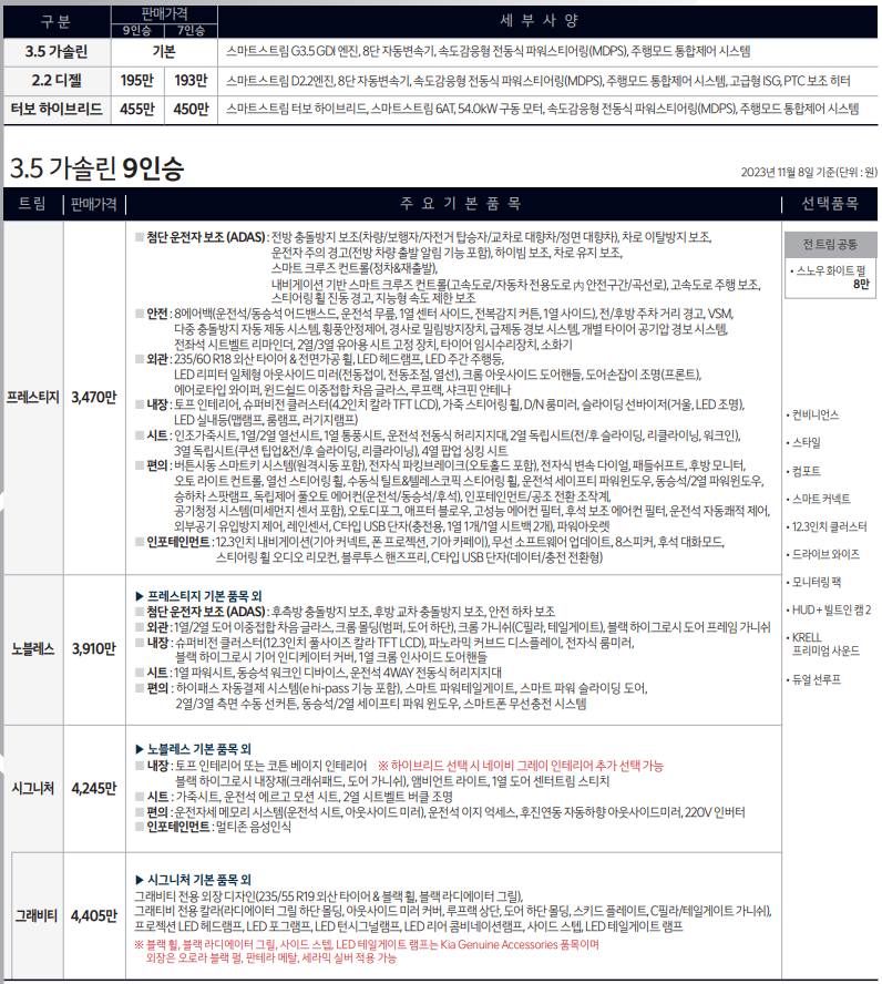 카니발 9인승 기본 가격은 프레스티지 3,470만원, 노블레스 3,910만원, 시그니처 4,245만원, 시그니처 그래비티 4,405만원입니다. 2.2디젤의 경우 195만원, 하이브리드 455만원이 추가되고, 옵션을 추가하면 가격이 상승합니다.