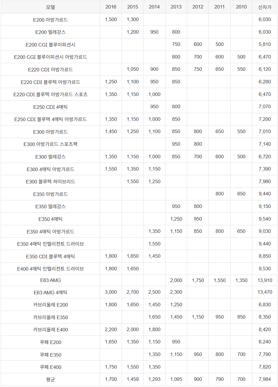 E220d 4매틱 익스클루시브 | 5,000 | 4,500 | 4,200 | 3,600 | 3,100 | 2,700 | 2,500 | 8,230 |