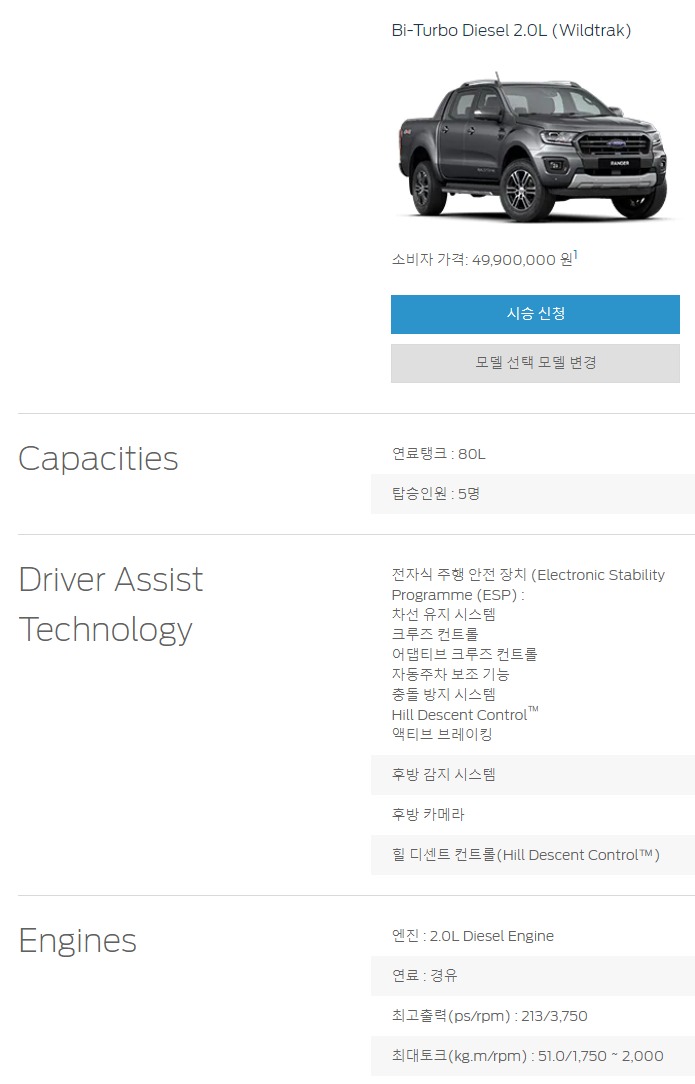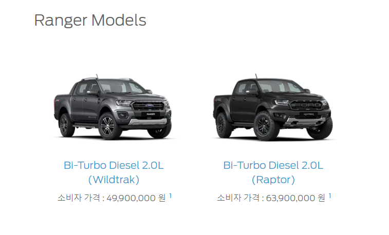 - SUV 라인업 강화를 선언한 포드코리아는 SUV 라인업 강화를 선언하고 2021년 4월 12일 출시했습니다. 와일드트랙과 랩터 모델은 남아프리카에서 생산되고 수입됩니다. 2.0L 트윈 터보 디젤 엔진과 51kg.fm의 10단 자동변속기 213마력을 탑재했습니다. 적재 용량은 와일드 트랙 600kg, 랩터 300kg입니다.
