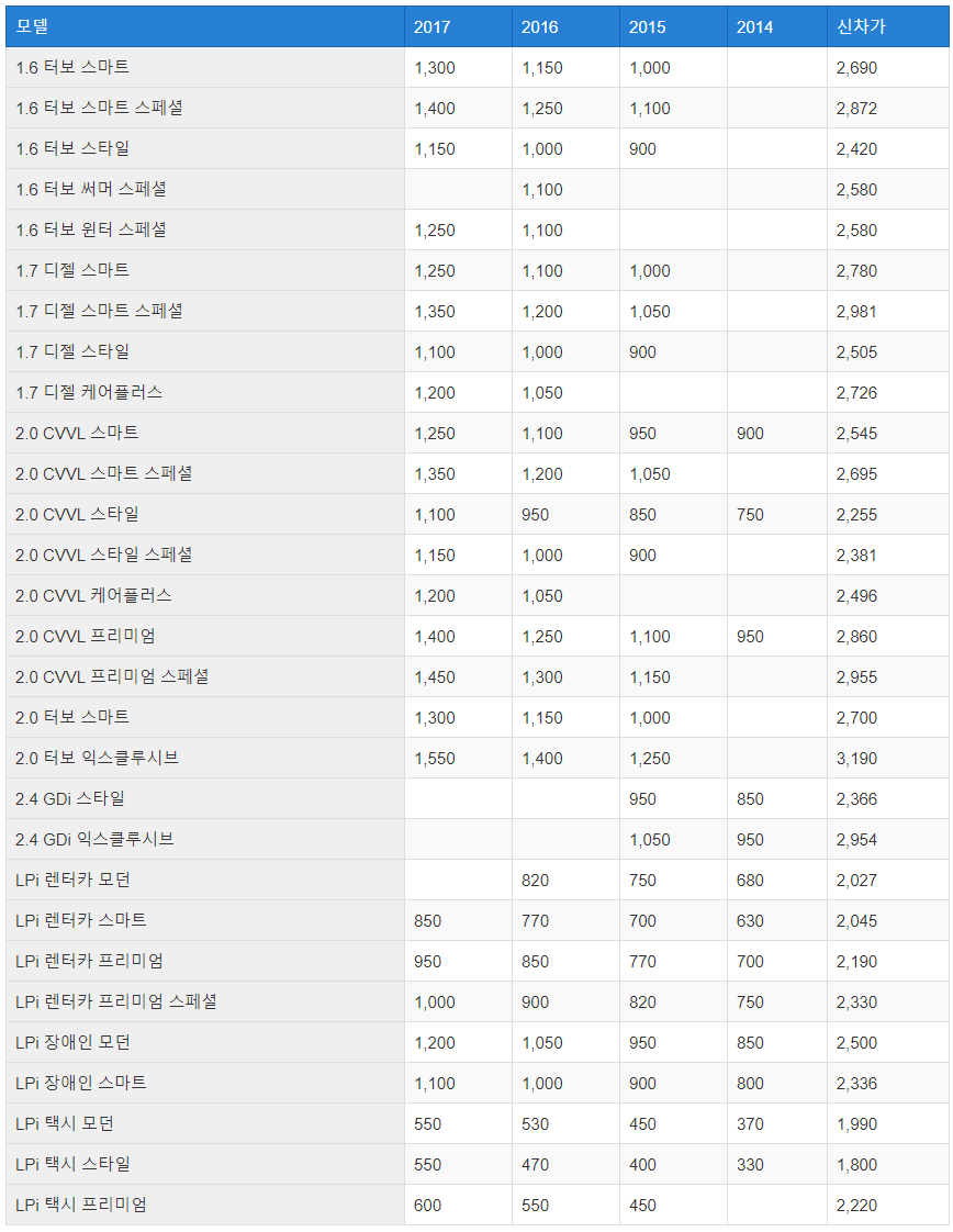 | 모델 | 2017 | 2016 | 2015 | 2014 | 신차가 |
