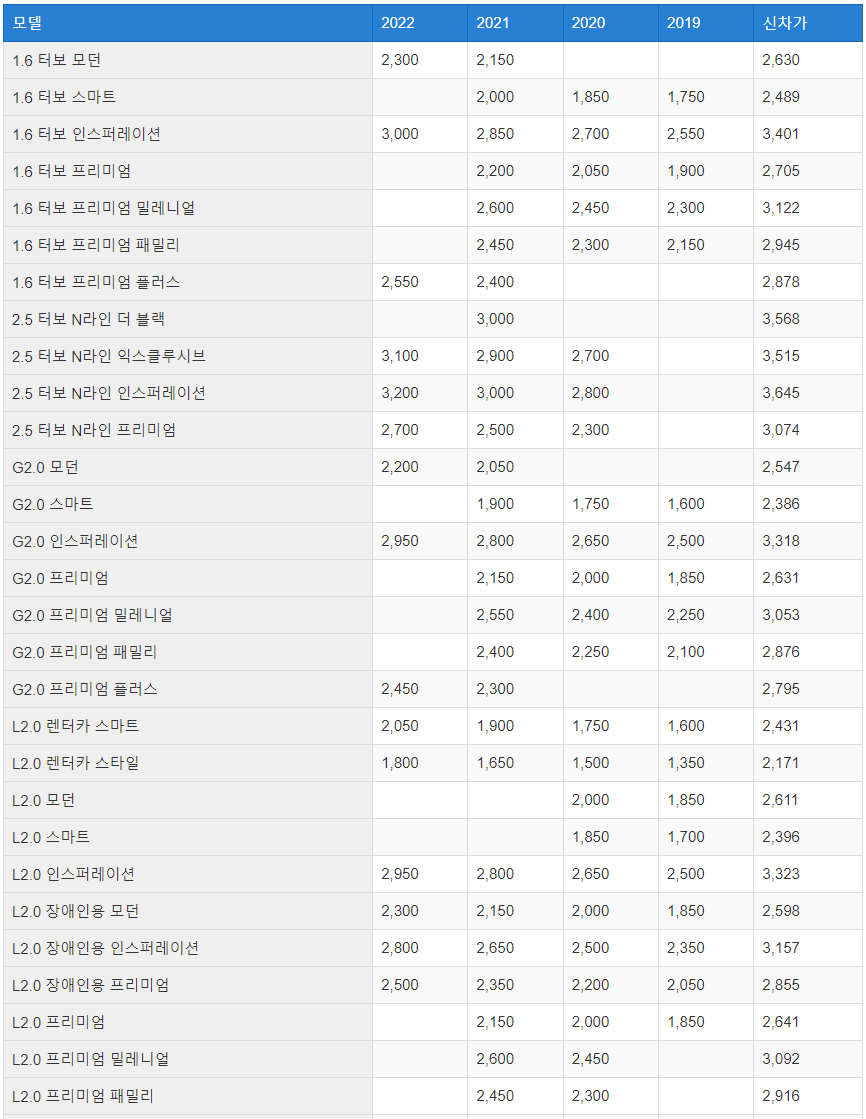 | 모델 | 2022 | 2021 | 2020 | 2019 | 신차가 |