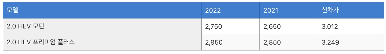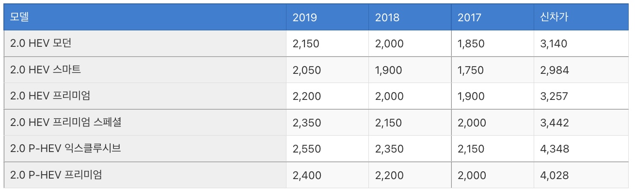 | 2.0 HEV 모던 | 2,150 | 2,000 | 1,850 | 3,140 |