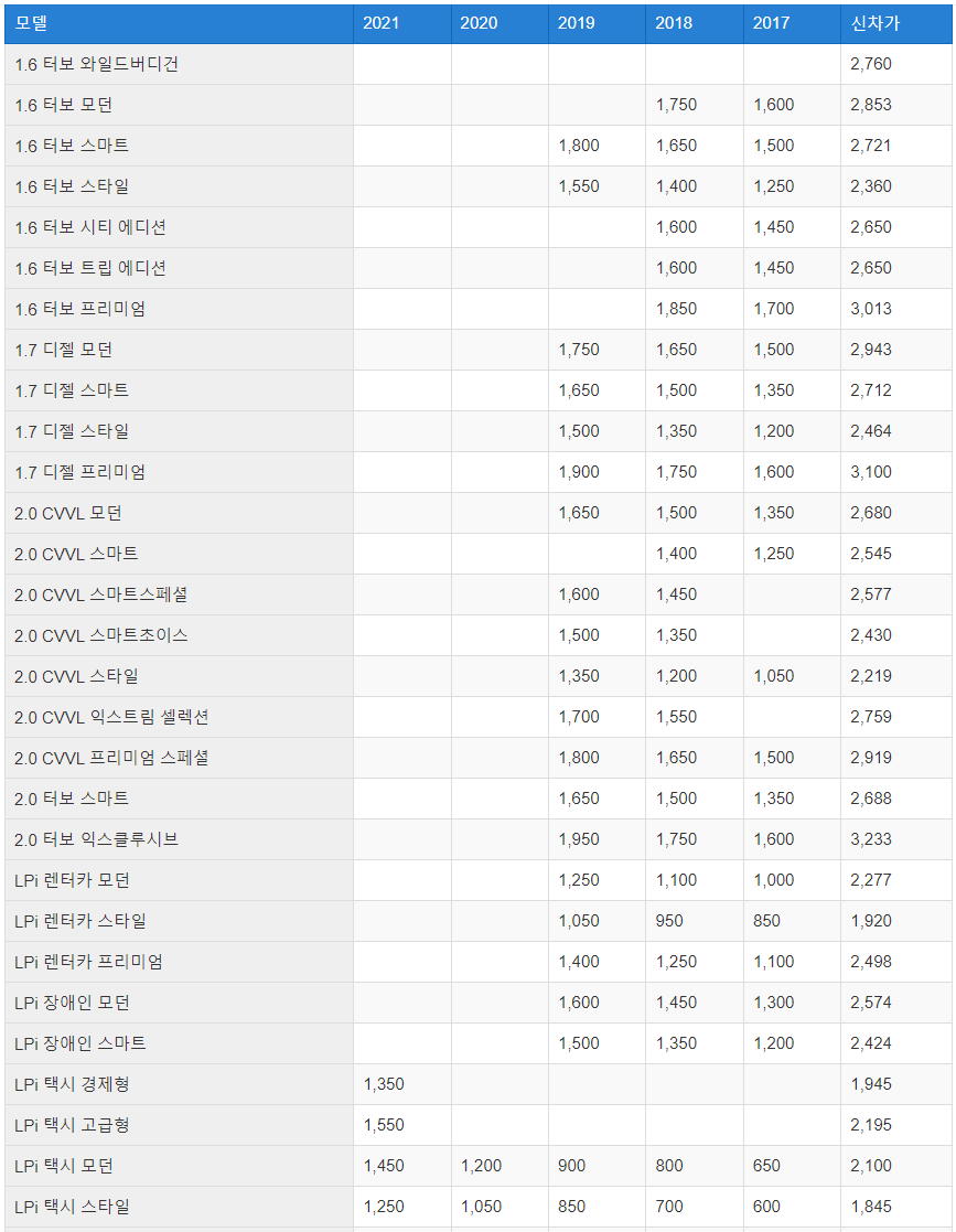 | LPi 택시 모던 | 1,450 | 1,200 | 900 | 800 | 650 | 2,100 |