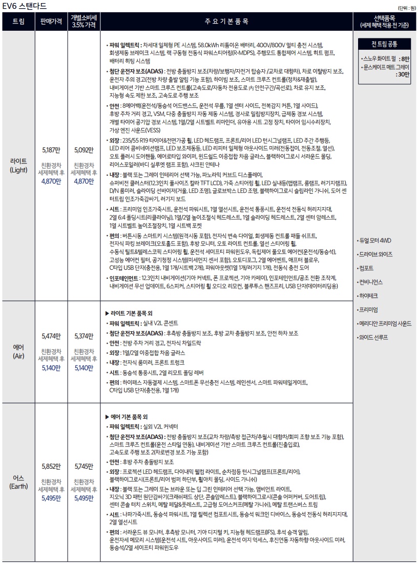 EV6 가격은 스탠다드 라이트 4870만원, 에어 5140만원, 어스 5495만원입니다. 롱레인지 라이트 5260만원, 에어 5530만원, 어스 5935만원, GT라인 5995만원 입니다. 옵션을 추가하면 가격이 상승하게 됩니다.